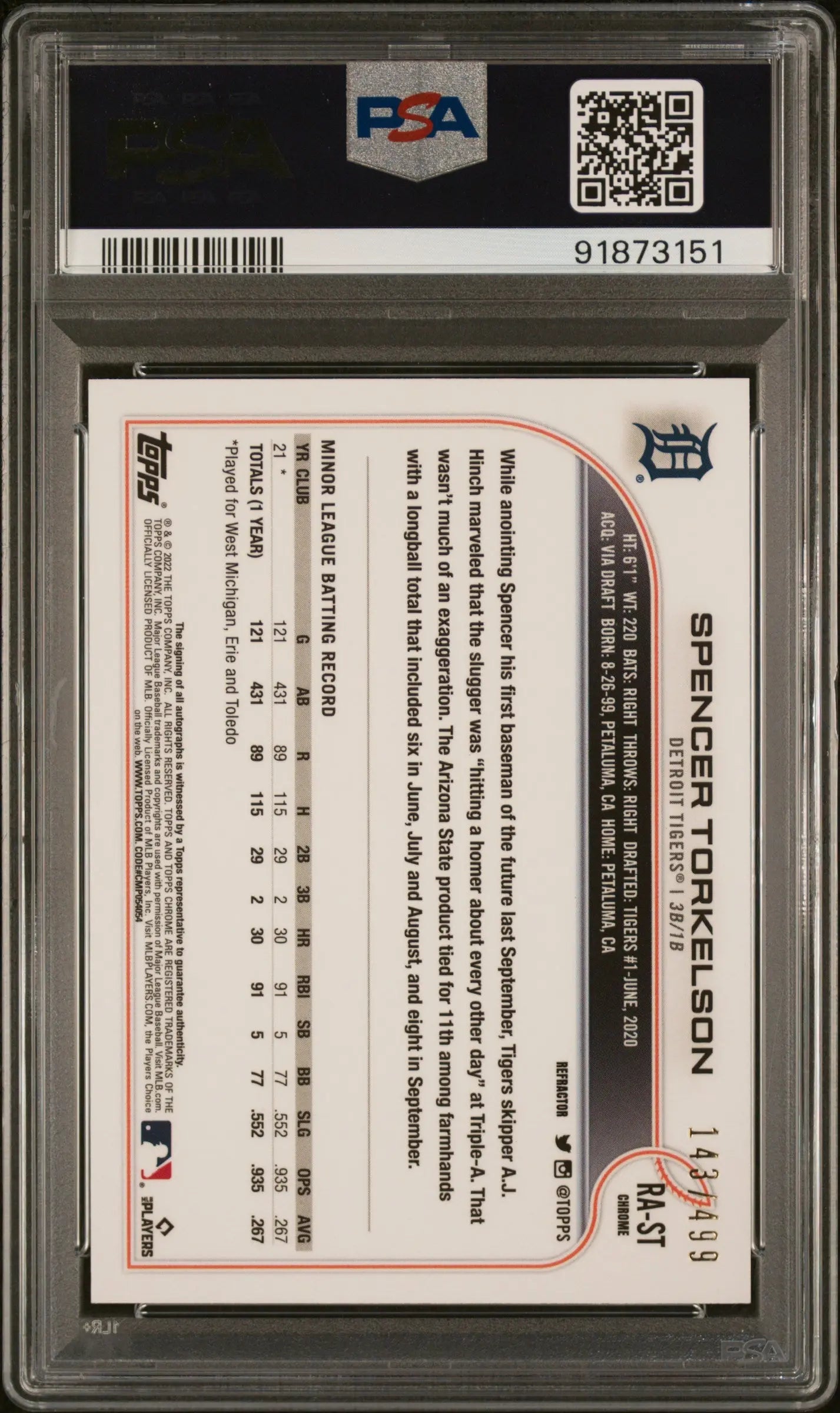 • Tarik Skubal Auto /50 PSA 9 2021 RC Rookie Topps Significant Stats Autograph