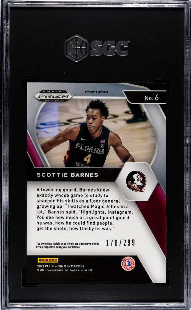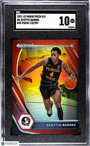 Unveil a gem in the world of basketball collectibles with the 2021-22 Panini Prizm Draft Picks Scottie Barnes RC Red Prizm SGC 10 170/299. This Scottie Barnes rookie card is a must-have for any serious collector or fan of the rising basketball star.