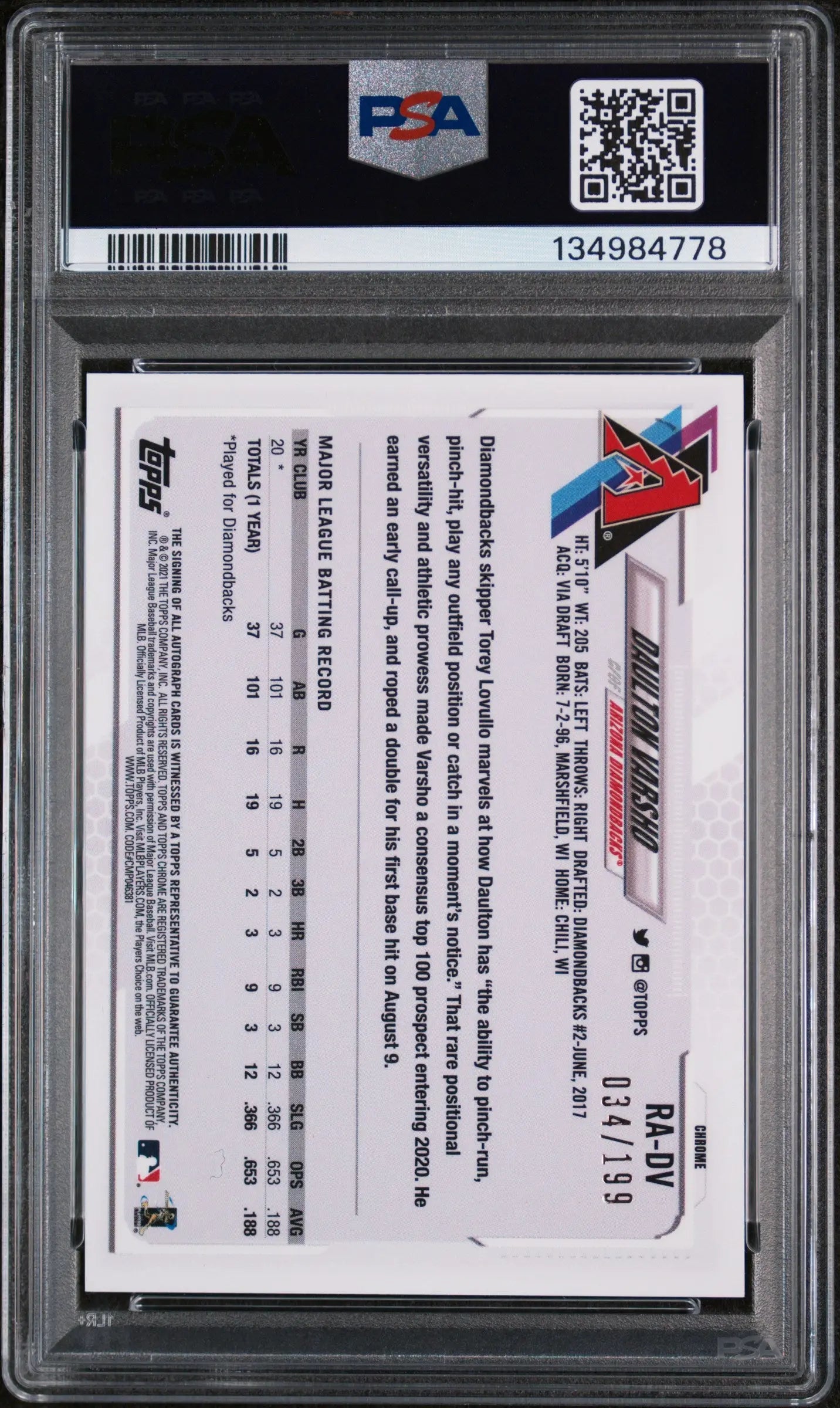 You are purchasing a 2021 Topps Chrome Rookie Autographs Daulton Varsho #RADV Aqua Refractor PSA 9. You will receive the exact item in the photographs. Thank you for looking. Listed With Mascot.