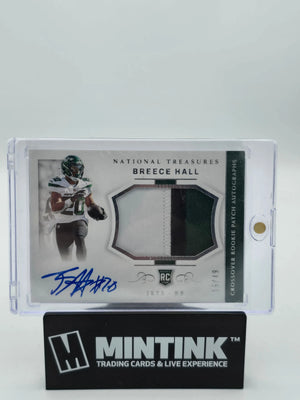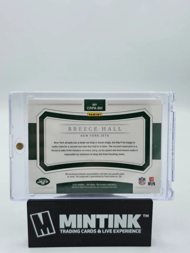 Featuring a unique crossover rookie patch auto, this card captures the essence of Breece Hall's rookie season. The autograph and patch are authentic, adding a personal touch from Hall himself. This is more than just a card; it's a piece of football history.
