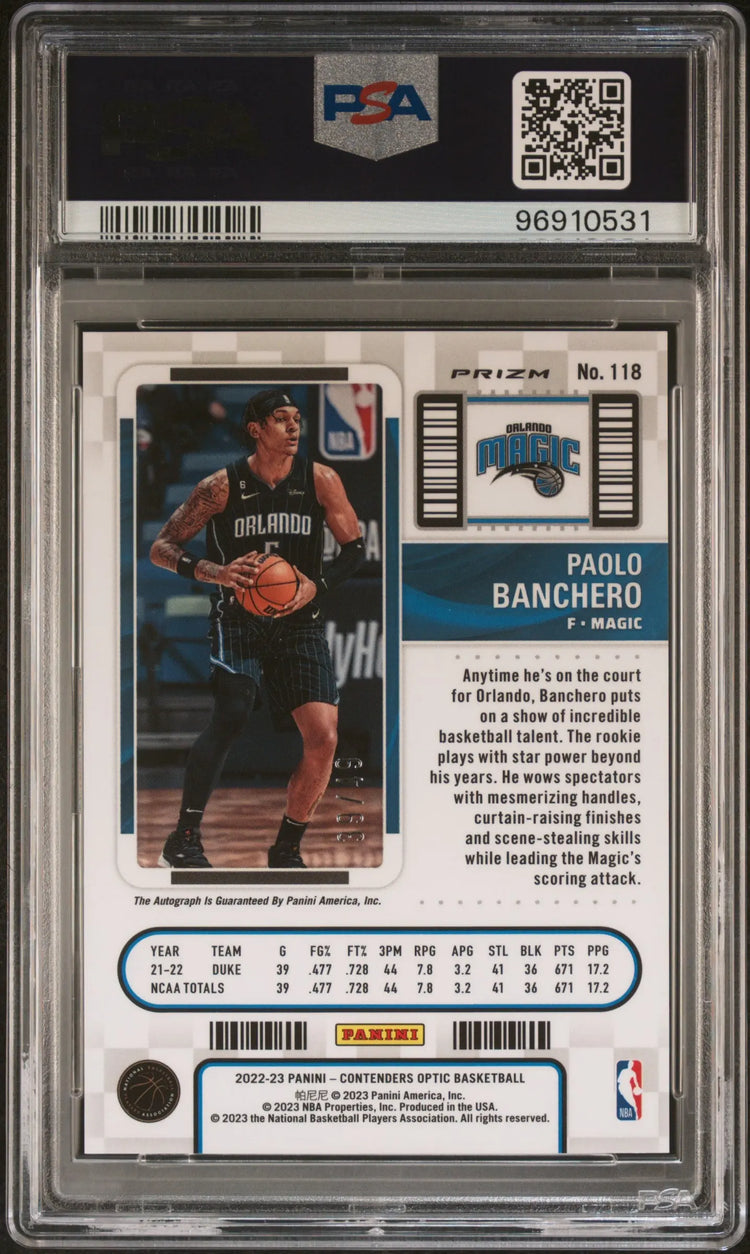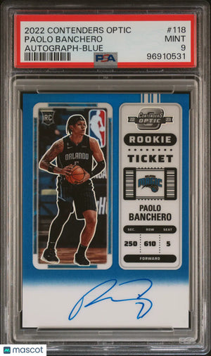 Looking for a Paolo Banchero rookie card for sale? This 2022 Panini Contenders Optic Rookie Ticket Auto is a must-have for any serious collector. With a PSA 9 grade, this card is not only a testament to Banchero's promising career but also a valuable addition to your collection.