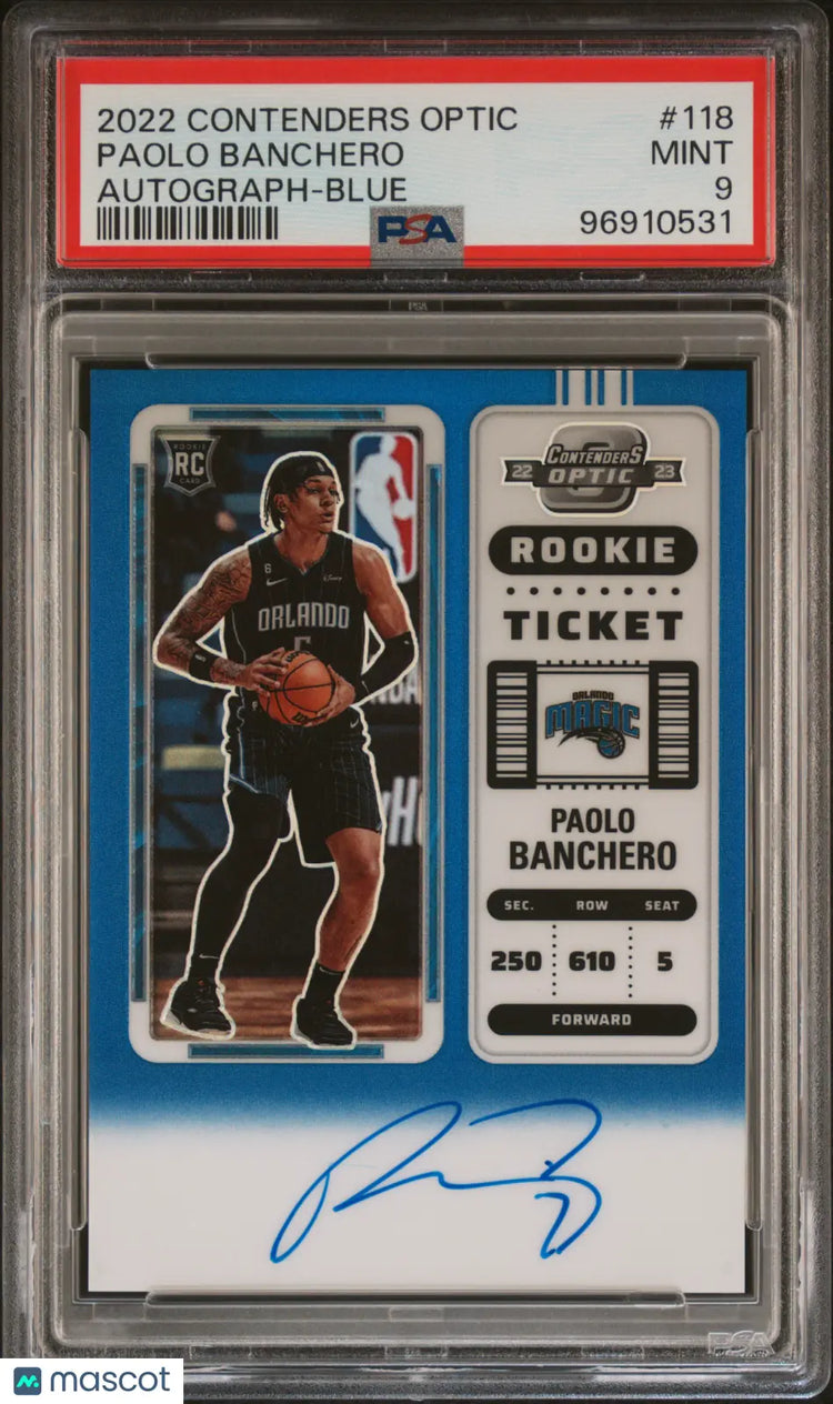You are purchasing a 2022 Panini Contenders Optic Rookie Ticket Auto Blue Paolo Banchero PSA 9 39/49. You will receive the exact card in the photographs. Thank you for looking. Listed With Mascot.