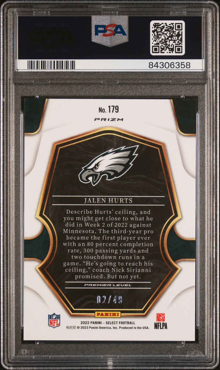 Don't miss out on this opportunity to own a Panini Select Jalen Hurts collectible. Whether you're looking to invest or simply show off your fandom, this card is the perfect choice. Jalen Hurts PSA 9 card 49 is waiting for you!