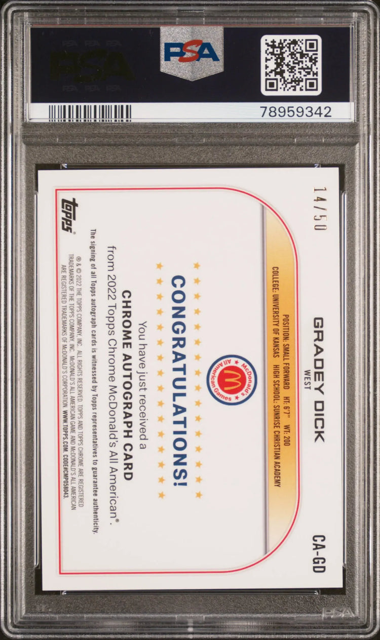 Whether you're searching for a Topps Chrome McDonald's All-American Gradey Dick card or looking to add a Gradey Dick Gold Wave Auto PSA 9 for sale to your collection, this card is a perfect choice. Don't miss the opportunity to own a piece of basketball's future stars.