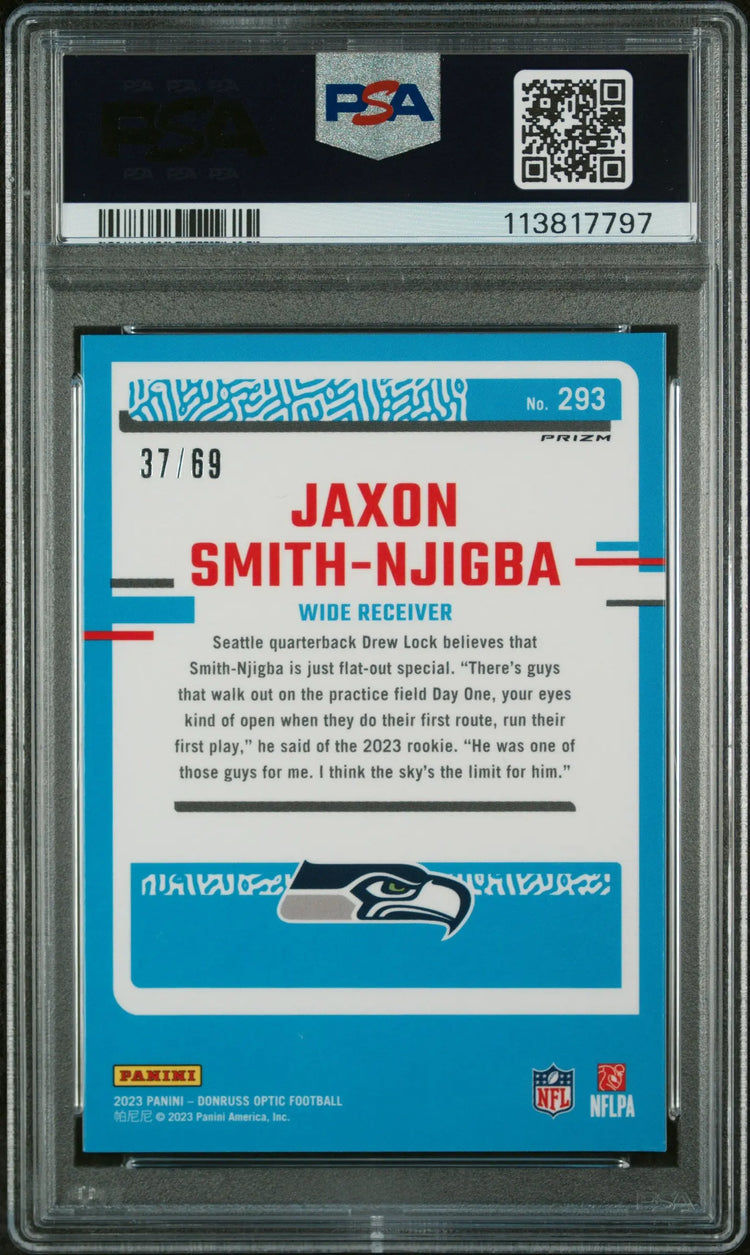 You are purchasing a 2023 Panini Donruss Optic Jaxon Smith-Njigba Rated Rookie Electricity PSA 8 /69. You will receive the exact item in the photographs. Thank you for looking. Listed With Mascot.