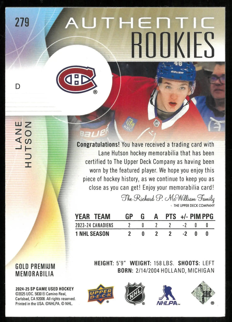 2024-25 UD SP Game Used Lane Hutson Authentic Rookies Gold Premium Memorabilia /25