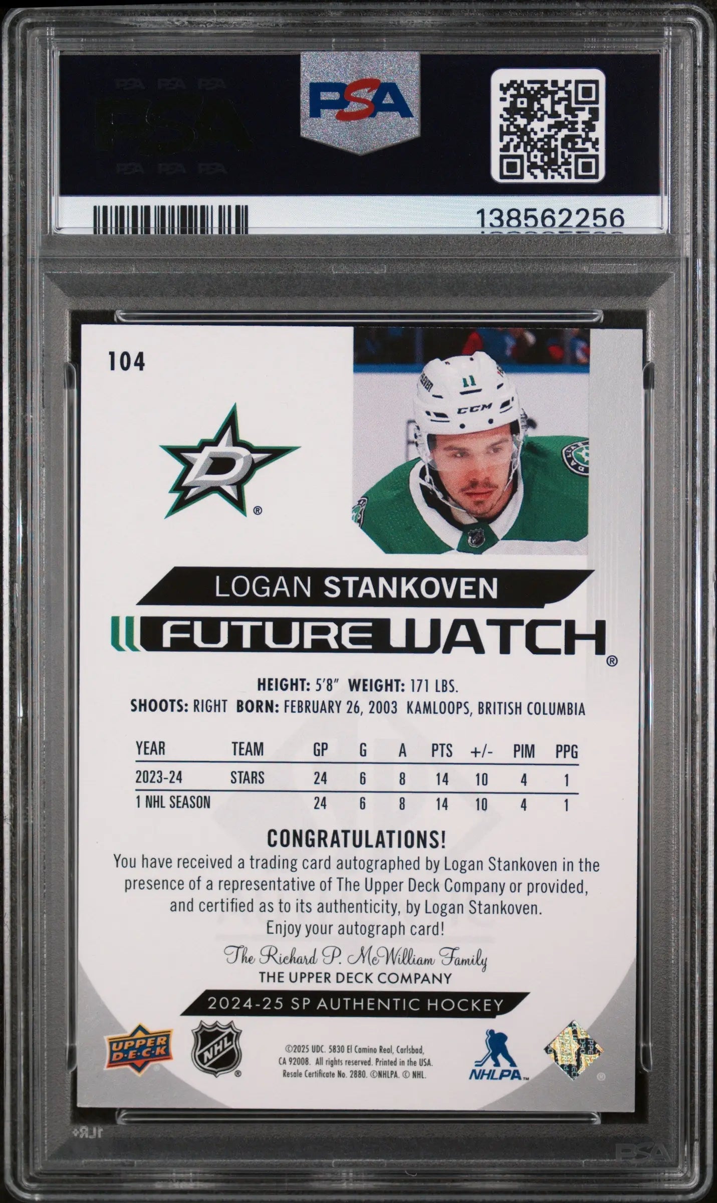 2024 Upper Deck SP Authentic Logan Stankoven Autograph Inscription PSA 8 /999