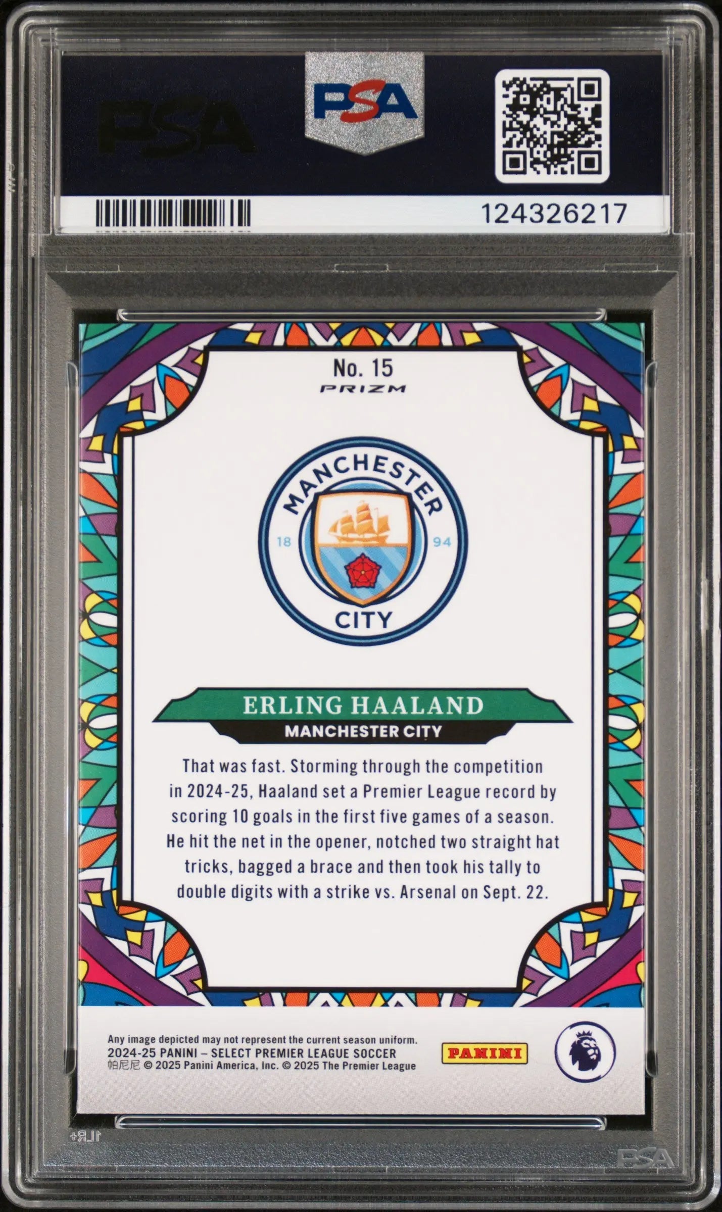 You are purchasing a 2024-25 Panini Select Premier League Stained Glass Erling Haaland #15 PSA 10. You will receive the exact item in the photographs. Thank you for looking. Listed With Mascot.