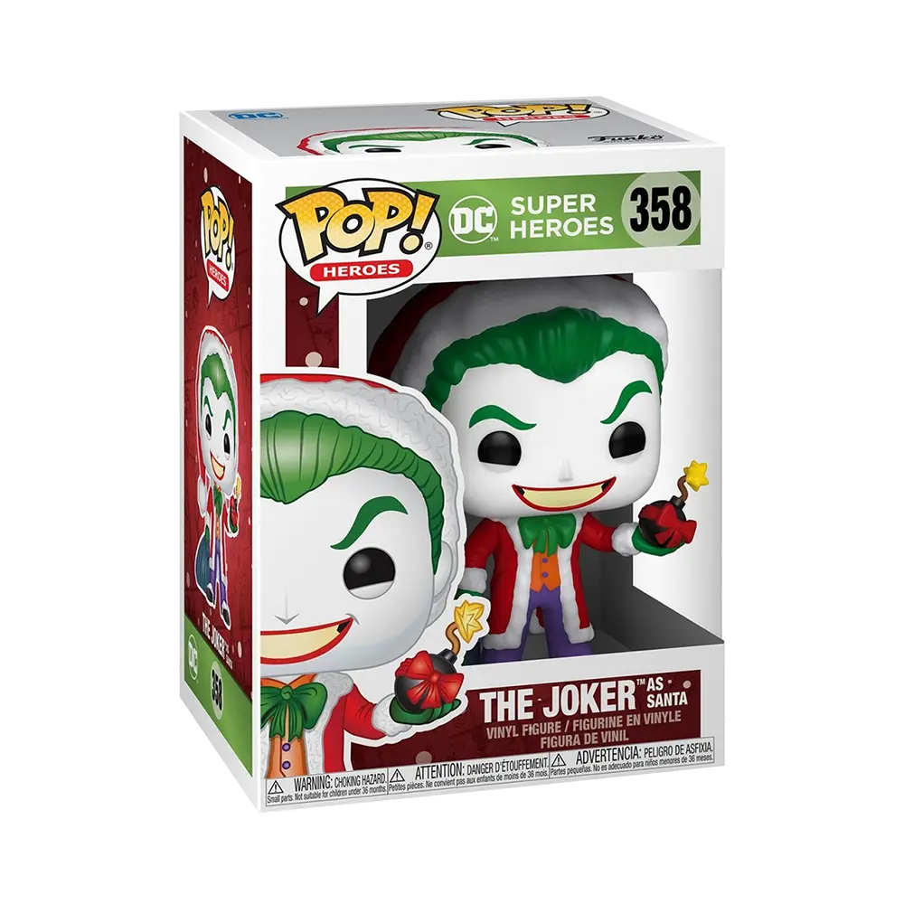 It's Christmas with the Joker! The Clown Prince of Crime is ready to spread some holiday jeer. This DC Holiday the Joker Funko Pop! Heroes vinyl figure features him dressed up as Santa holding a very special present for Batman.