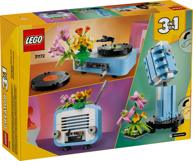 - 3 LEGO® music set building options in 1 box – The LEGO Creator 3in1 Record Player with Flowers toy playset lets kids aged 8 and up build and rebuild 3 different retro-style models with the same bricks