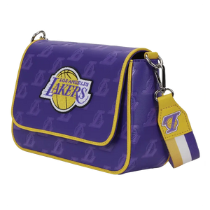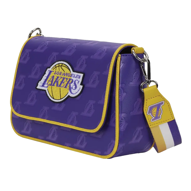 Team up and show your spirit with this NBA Los Angeles Lakers Logo Crossbody Bag. On the front, the embroidered Los Angeles Lakers logo, with the fast-moving golden basketball, prominently appears over the front flap, against a field of purple, with a debossed pattern motif of the team logo. Shoulder straps are fashioned in gold, white, and purple stripes.