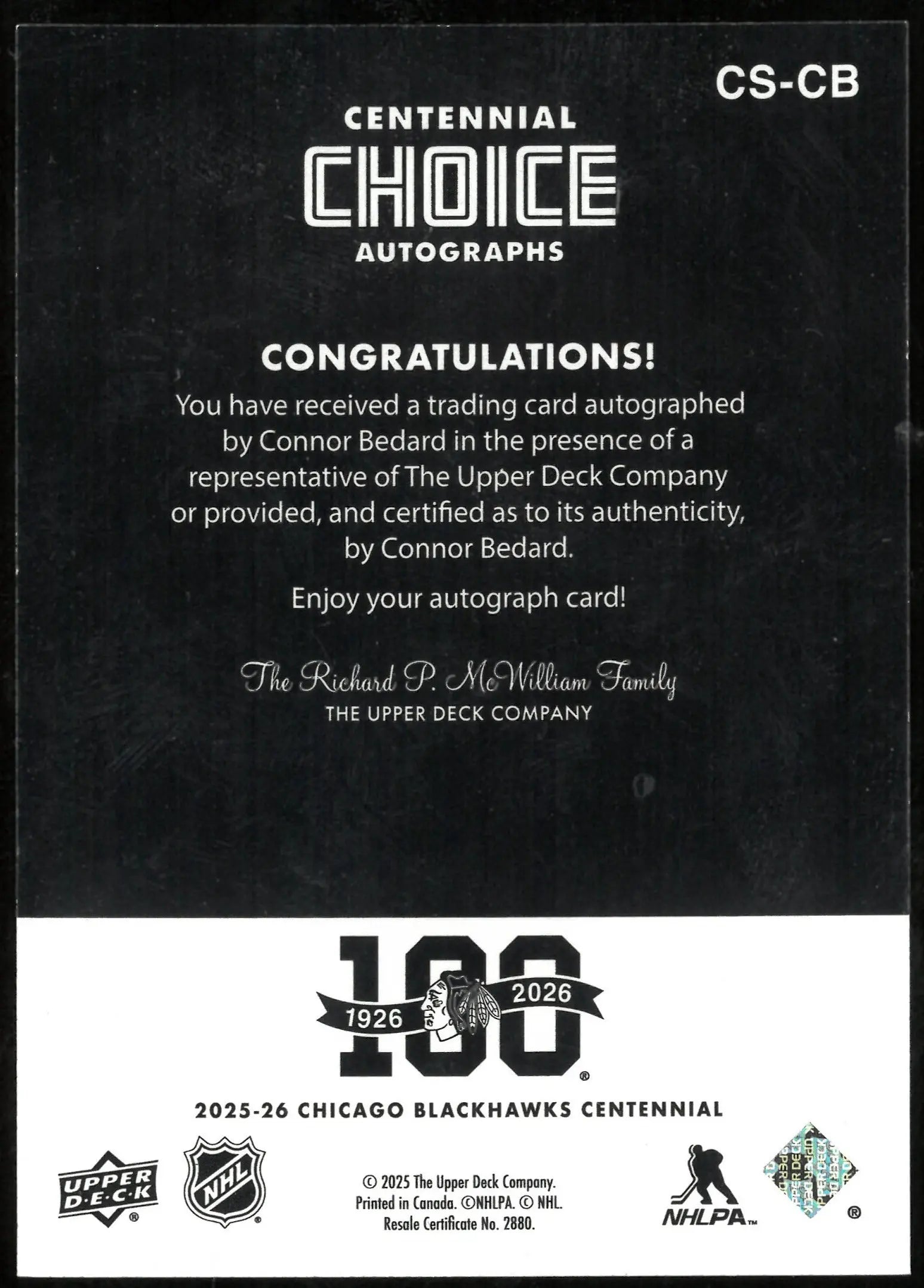 Connor Bedard Auto Blackhawks UD Centennial Choice 2025-26 SSP