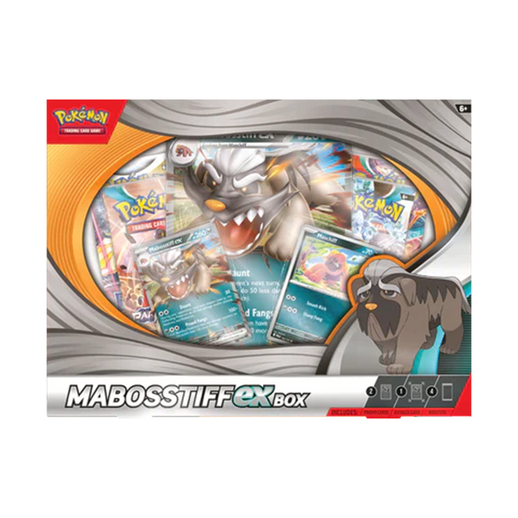 Each box includes a foil promo card featuring the intimidating yet loyal Mabosstiff ex, a foil card featuring the Rascal Pokemon Maschiff, and an oversize foil card featuring Mabosstiff ex. You'll also get 4 Pokemon TCG booster packs to expand your collection and a code card for Pokemon TCG Live.