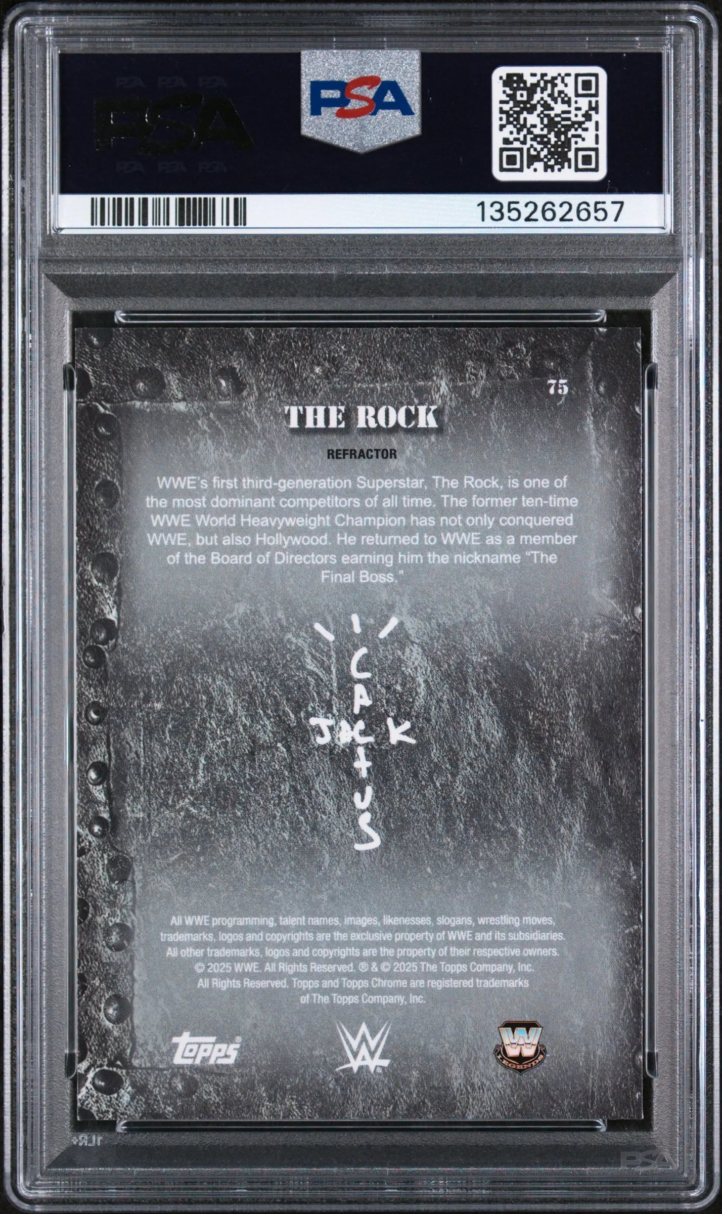 You are purchasing a 2025 Topps Chrome WWE X Cactus Jack The Rock #75 Refractor PSA 10. You will receive the exact item in the photographs. Thank you for looking. Listed With Mascot.
