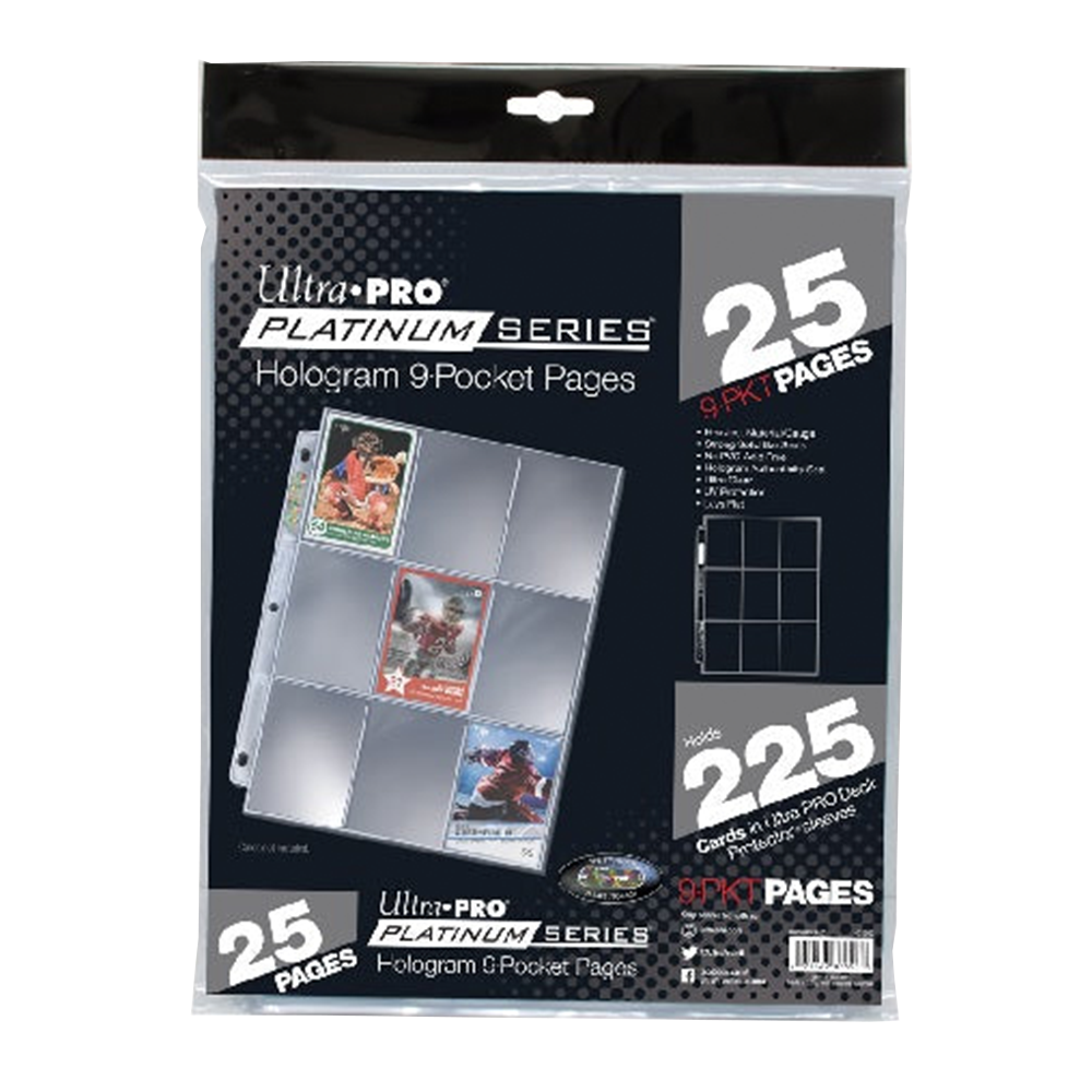 A part of Ultra PRO's flagship line storage pages, Supplies, these Platinum Series 9-pocket pages are the premier choice for collectible trading cards, Supplies, postcards, Supplies, photos, Supplies, artist sketch cards, Supplies, ticket stubs, Supplies, coupons, Supplies, and so much more. Each page bears Ultra PRO's hologram quality & authenticity seal on the spine. These pages are 3-hole punched and sized to fit in Ultra PRO's standard-size 3-ring albums.