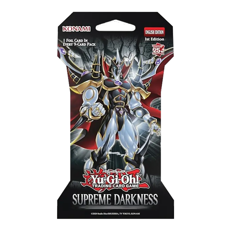The Yu-Gi-Oh Supreme Darkness Booster Pack is packed with 101 new cards, including a brand-new World Premiere theme. As part of the 25th Anniversary Celebration, it also includes 25 Quarter Century Secret Rares, with one special card only available in this format!